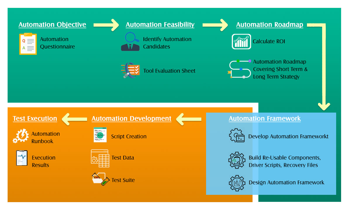 - Plan for the required automation tools, the reusable components and developing the in -house automation tools.